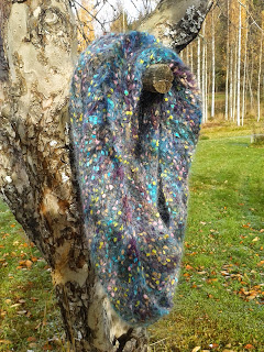 Tuubihuivin tein alennusmyynnistä ostetusta Novitan Silmusta. Samalla mallilla olen tehnyt aikaisemmin itselleni huivin. Viidestä kerästä puolet meni tuubihuiviin.